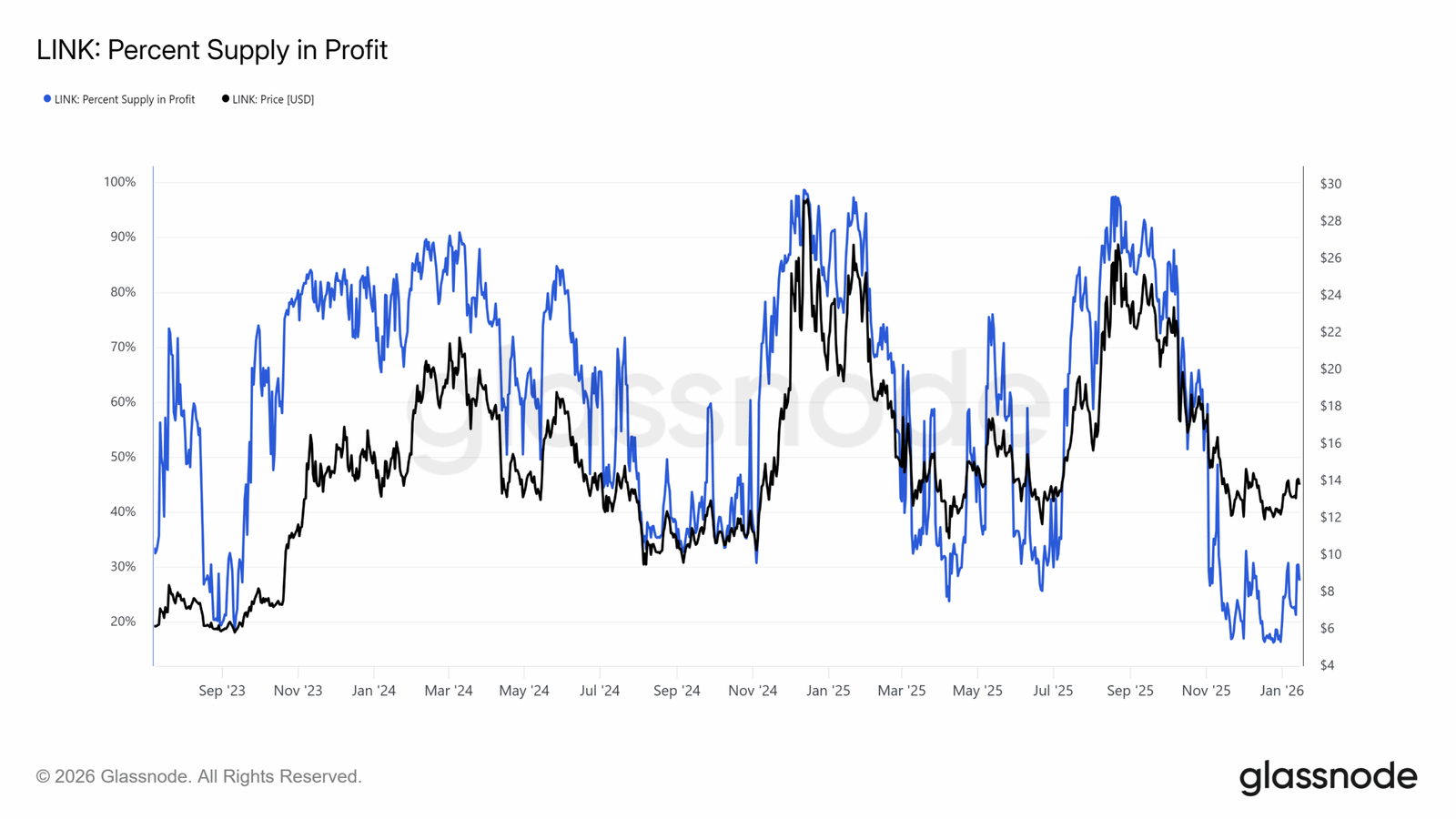 Die Kennzahl „Angebot am Gewinn“ von Chainlink misst den Prozentsatz des zirkulierenden Angebots am Gewinn. Im November und Dezember erreichte die Kennzahl Tiefststände, die seit September 2023 nicht mehr erreicht wurden.