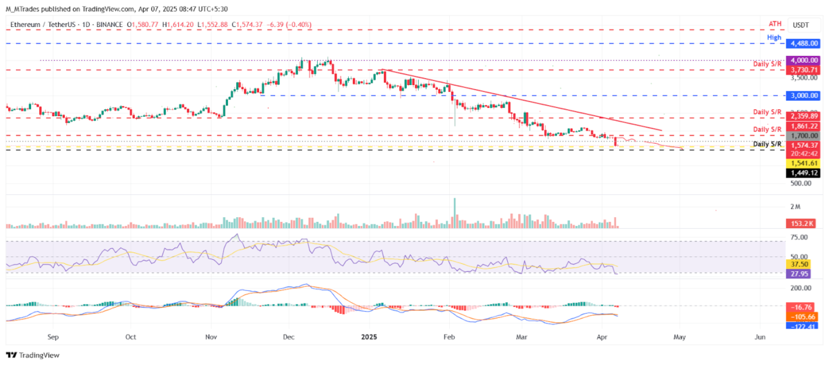 Der ETH -Preis hat den Tod von Bitcoin mit einem ausgeprägteren Verlust von 13% für die Woche dupliziert. Die ETH fiel nicht über das tägliche Widerstand von 1.861 US -Dollar und fiel dann am Sonntag die Marke von 1.700 US -Dollar – ein Niveau, das es seit Oktober 2023 nicht mehr gesehen hatte. Bis Montag fiel die ETH auf rund 1.575 US -Dollar.