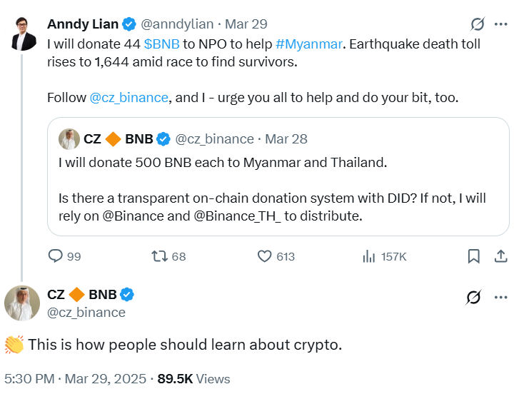 Lian spendete auch 44 BNB -Token für die Hilfsmaßnahmen in Myanmar und Thailand, ein Schritt, der von Zhao öffentlich gelobt wurde.
