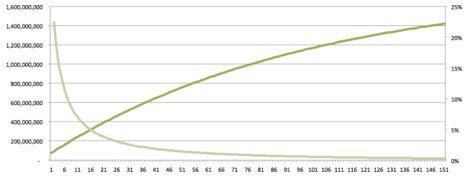 Wenn wir davon ausgehen, dass Ethereum im Vorverkauf 40.000 BTC-Im Wert von 40.000 BTC verkauft und wir davon ausgehen, dass der Durchschnittspreis 1500 ETH/ BTC beträgt, werden im Genesis-Block 60.000 ETH geschaffen und den Käufern zugeordnet. Auf Dauer werden jedes Jahr 18.000.000 ETH durch den Bergbauprozess ausgestellt. Unter Berücksichtigung der Schaffung neuer ETH und des vorhandenen ETH im ersten Jahr entspricht dies eine Geldinflationsrate von 22,4%. Im zweiten Jahr sinkt die Rate auf 18,1%. Im zehnten Jahr beträgt der Preis 7,0%. Im Jahr 38 erreicht es 1,9%. Und im 64. Jahr wird der Niveau von 1,0% erreicht.