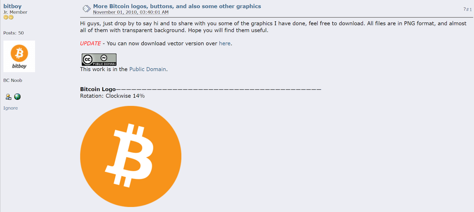 Nakamoto stellte jedoch am 24. Februar 2010 ein neues Logo ein, das den „BC“ -Text durch „₿“ ersetzte.