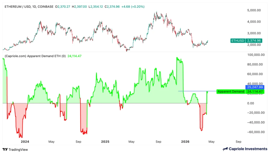Die Kennzahl der scheinbaren Ethereum-Nachfrage von Capriole Investment verrät dass die Nachfrage nach Ether seit dem 8. April positiv ist und am 14. April einen Höchststand von 24.111 ETH erreichte.