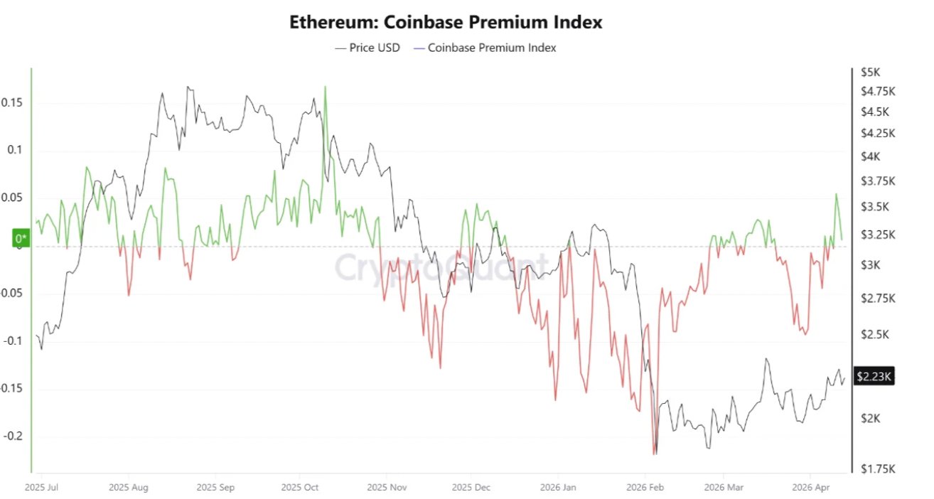 The ETH Coinbase premium index measures the price difference between the ETH/USD pair on Coinbase and Binance’s ETH/USD equivalent.