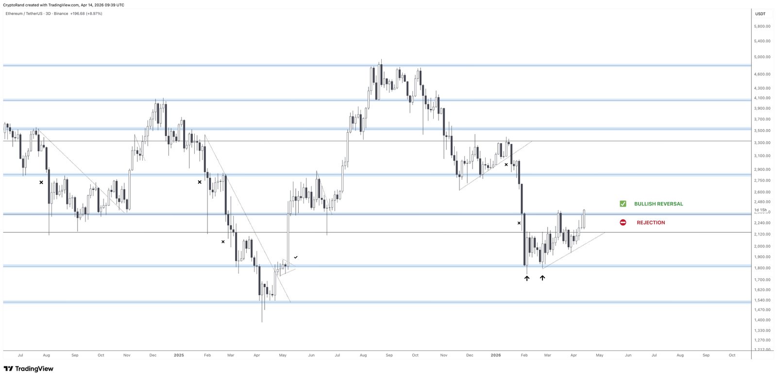 If history repeats itself, ETH may rally by more than 250% toward $6,300. Further confirmation of a trend reversal now hinges on Ether “crossing the key $2,400 range,” fellow analyst Cryptorand said, adding: