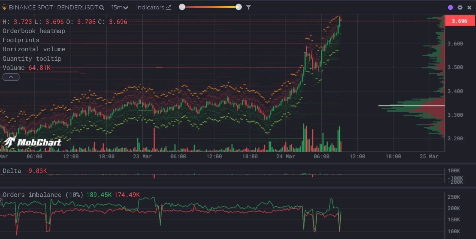Zum Zeitpunkt des Schreibens wurde Render mit 3,79 USD gehandelt, was einen täglichen Anstieg um 14,51% widerspiegelte. In den wöchentlichen Charts hat der Altcoin 18,96%zugenommen. Darüber hinaus ist das Handelsvolumen von Render um 73,42%gestiegen und erreichte 67,34 Mio. USD.