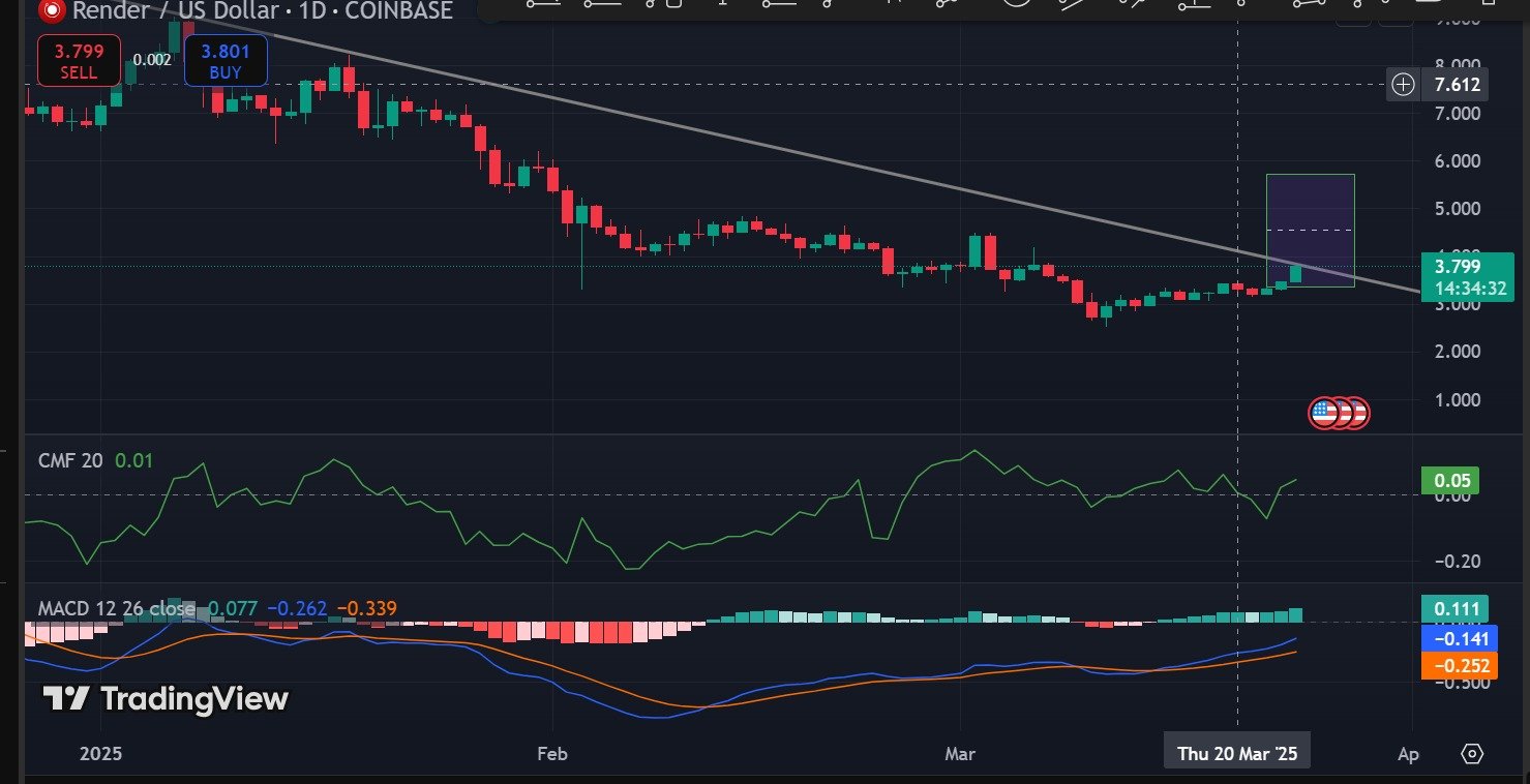 - Das Render brach aus der Konsolidierung aus und positionierte sich für einen Wechsel in Richtung 6 US -Dollar.