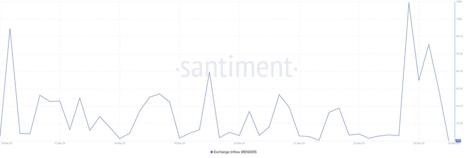 Render hat einen erheblichen Rückgang des Austauschzuflusses erlebt, wobei Santimentdaten im vergangenen Tag auf einen starken Rückgang von 117,7 Token hinweisen.