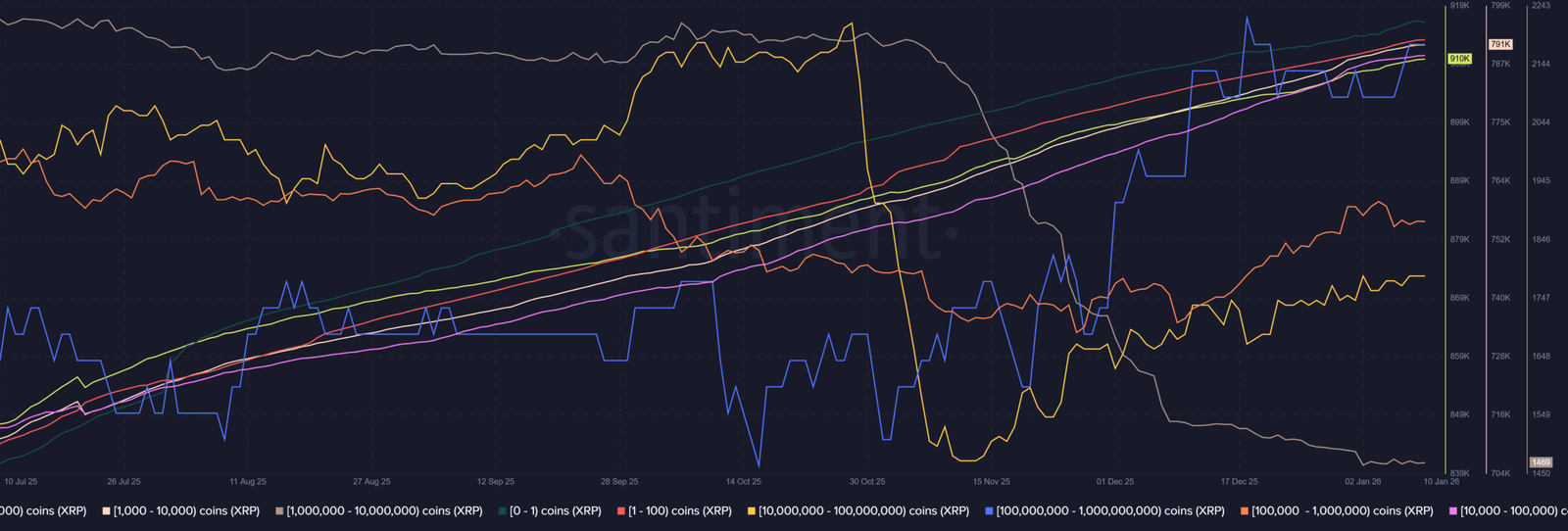 Von September bis Ende Oktober/Anfang November ging die Zahl der Wallets mit über 100.000 XRP zurück. Bei einigen Kohorten, etwa der 1- bis 100-Millionen-Gruppe (braun und gelb), war der Rückgang in diesen Monaten deutlich ausgeprägt.