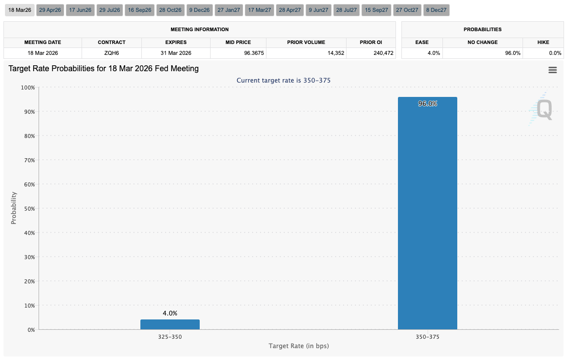 Die Zahlen verringerten die Wahrscheinlichkeit einer Zinssenkung der Fed auf ihrer März-Sitzung weiter, basierend auf Daten der CME Group FedWatch-Tool Jetzt liegt die Wahrscheinlichkeit einer Reduzierung um 0,25 % bei lediglich 4 %.