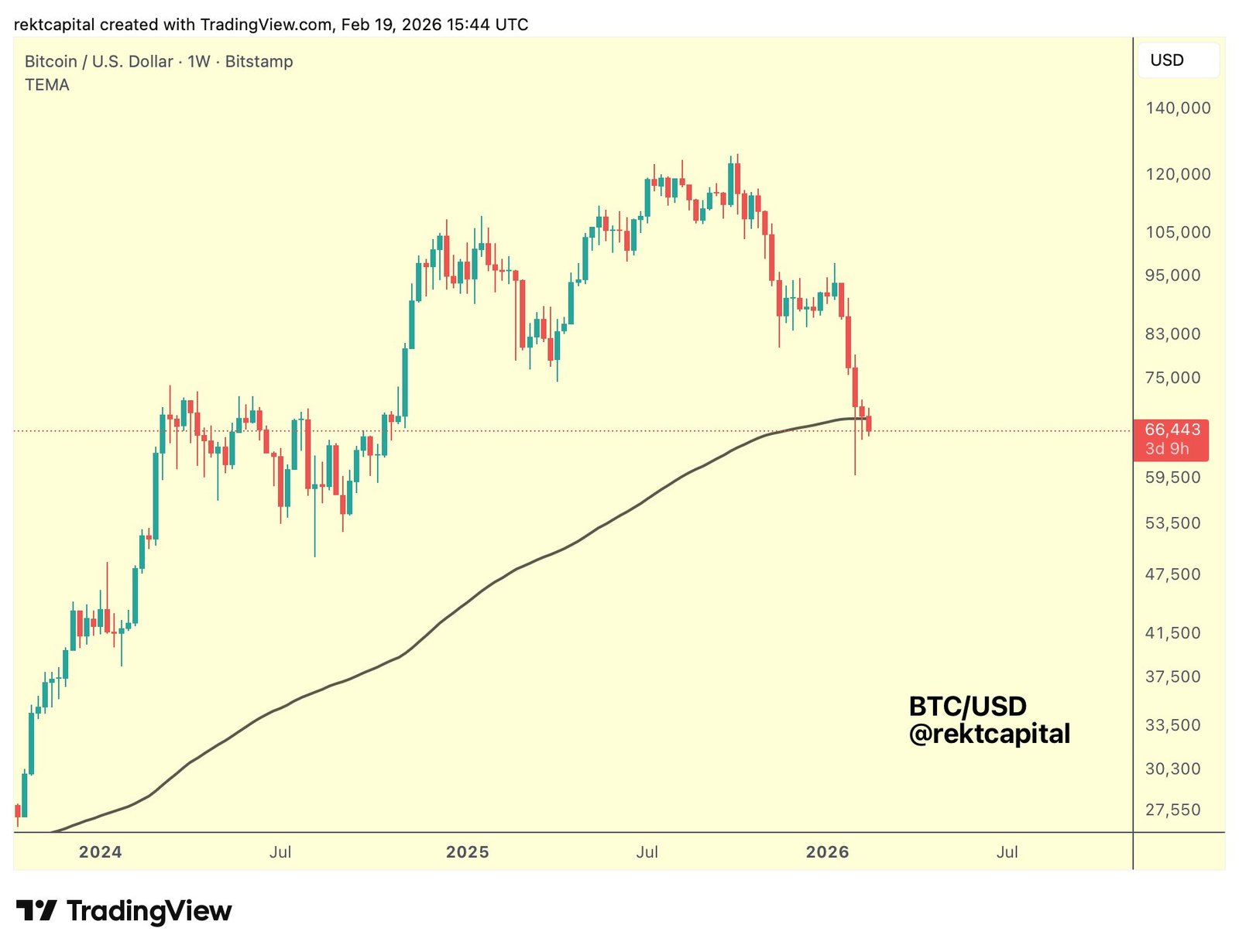 Trader and analyst Rekt Capital betont die Bedeutung des 200-wöchigen exponentiellen gleitenden Durchschnitts (EMA) zusammen mit dem Bitcoin-Risiko es auf Widerstand umdrehen.