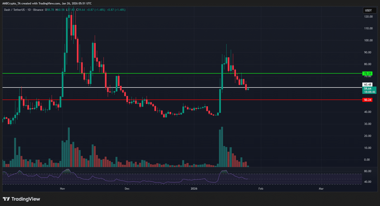 - Dash befindet sich weiterhin in der Korrektur, wobei Ausfälle unter 60–61 US-Dollar das Abwärtsrisiko auf 50 US-Dollar beschränken, während es bei Erholungen an Volumenüberzeugung mangelt.