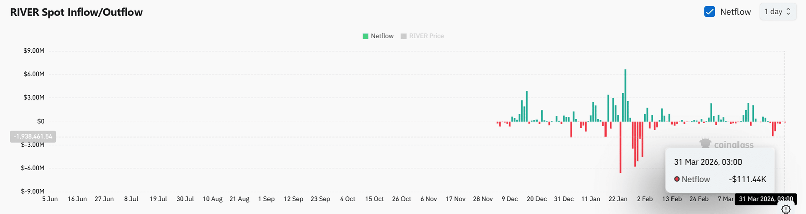 Die negativen Spot-Nettoflüsse beliefen sich zum Zeitpunkt des Schreibens auf -111,44.000 US-Dollar, was bestätigt, dass die Token die Börsen verlassen, anstatt in sie einzusteigen. Dieses Verhalten spiegelt laufende Abhebungen in private Wallets wider, was die unmittelbare Verfügbarkeit auf der Verkäuferseite verringert.
