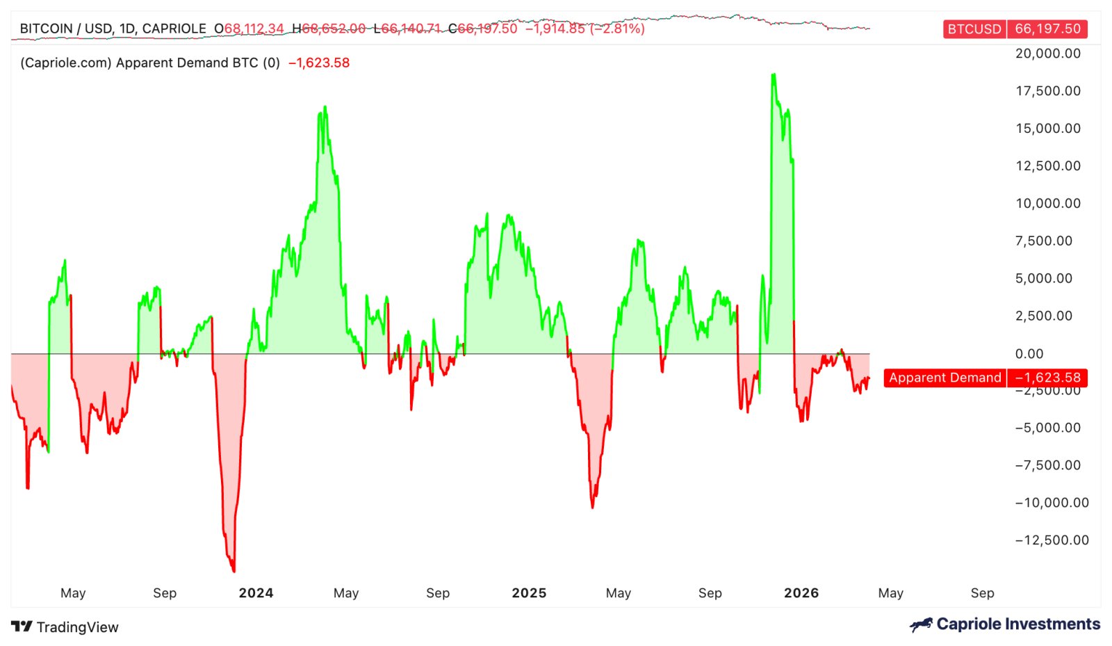 Die Bitcoin Apparent Demand-Metrik von Capriole Investment zeigt, dass die Nachfrage nach Bitcoin am Donnerstag bei -1.623 BTC liegt und dass die Verkäufer die Kontrolle haben.