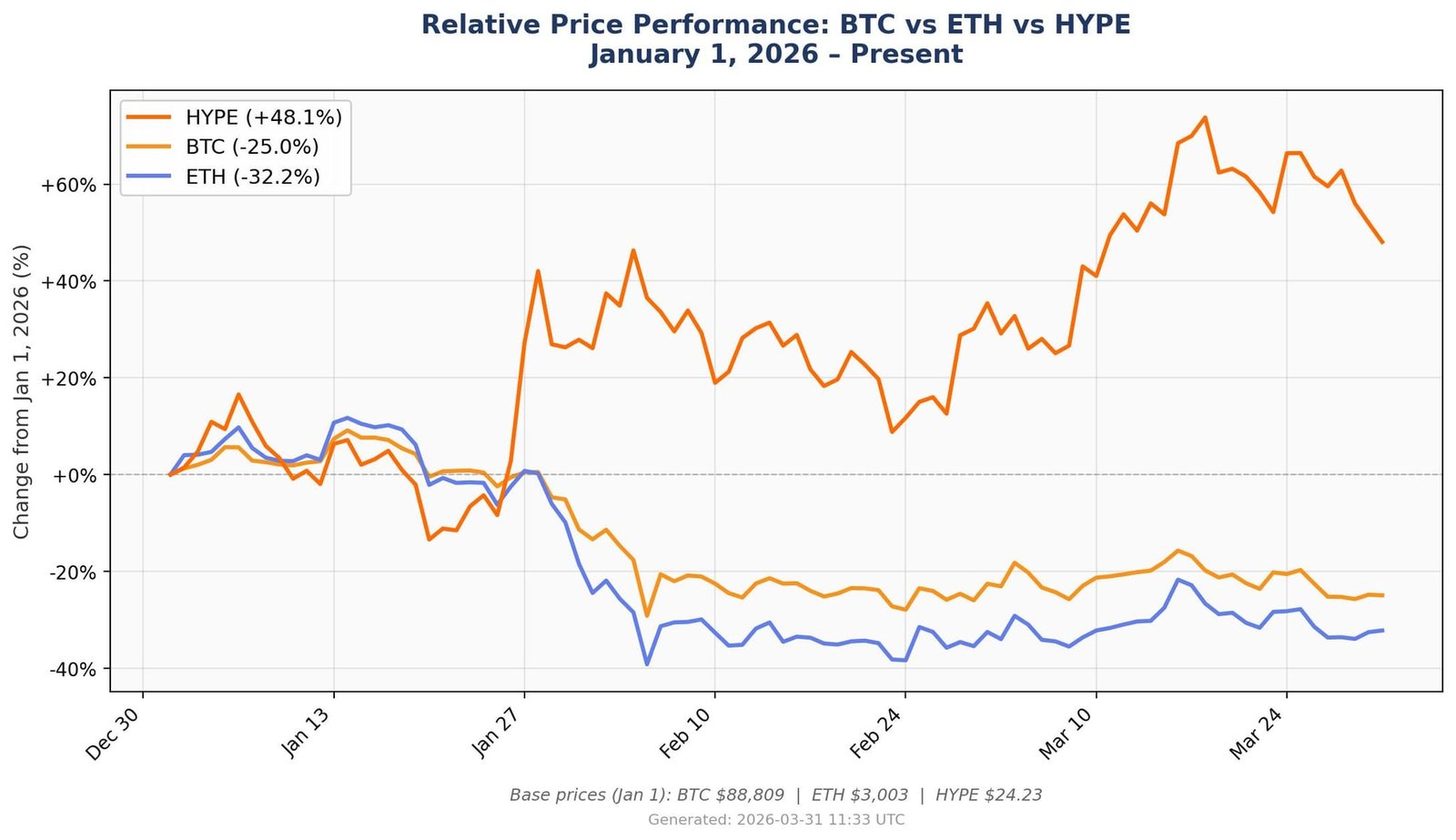 Hyperliquids HYPE hat das erste Quartal 2026 mit besseren Anlegerrenditen im Vergleich zu Bitcoin abgeschlossen [BTC] und Ethereum [ETH]. Der Altcoin verzeichnete vierteljährliche Zuwächse von 48 %, während BTC im gleichen Zeitraum um 25 % einbrach und ETH um 32 % einbrach.