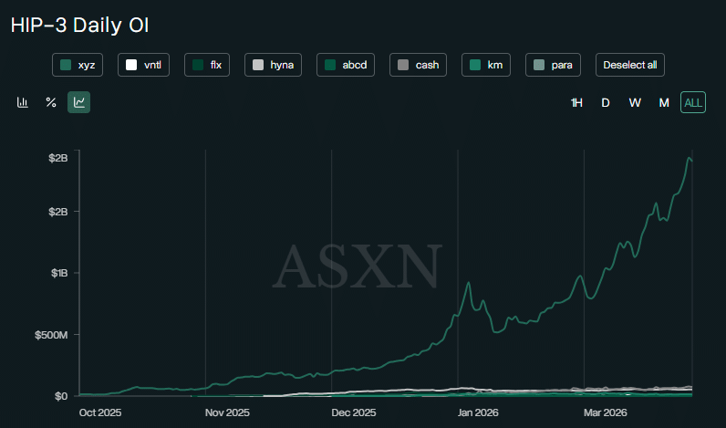 Ende März überschritt der tägliche Open Interest (OI) des HIP-3-Marktes erstmals die 2-Milliarden-Dollar-Marke. Interessanterweise halten auch Händler von Nicht-Krypto-Assets an der Plattform fest und erreichen einen Rekord 60 % Selbstbehalt im gleichen Zeitraum.