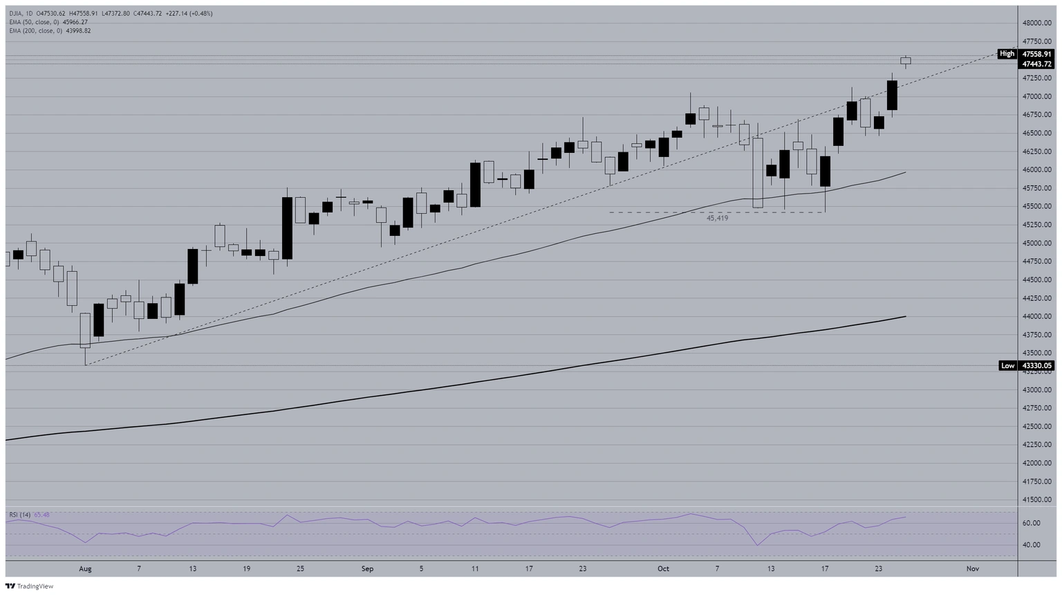 Der Dow Jones Industrial Average (DJIA) kletterte im frühen Montagshandel auf ein neues Rekordhoch und durchbrach zum ersten Mal überhaupt die Marke von 47.500, während sich die Stimmung der Anleger weiter erholte. Die Märkte wetten darauf, dass ein weiteres Last-Minute-Handelsabkommen zwischen den USA und China die schlimmsten der von Präsident Donald Trump angedrohten Zölle abwenden wird.