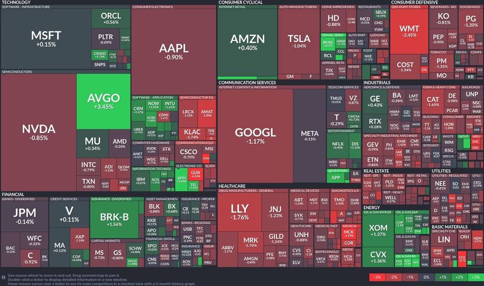 - Software – Infrastruktur: Das Segment Software-Infrastruktur verzeichnet positive Zuwächse, wobei Oracle (ORCL) um 0,56 % zulegte.