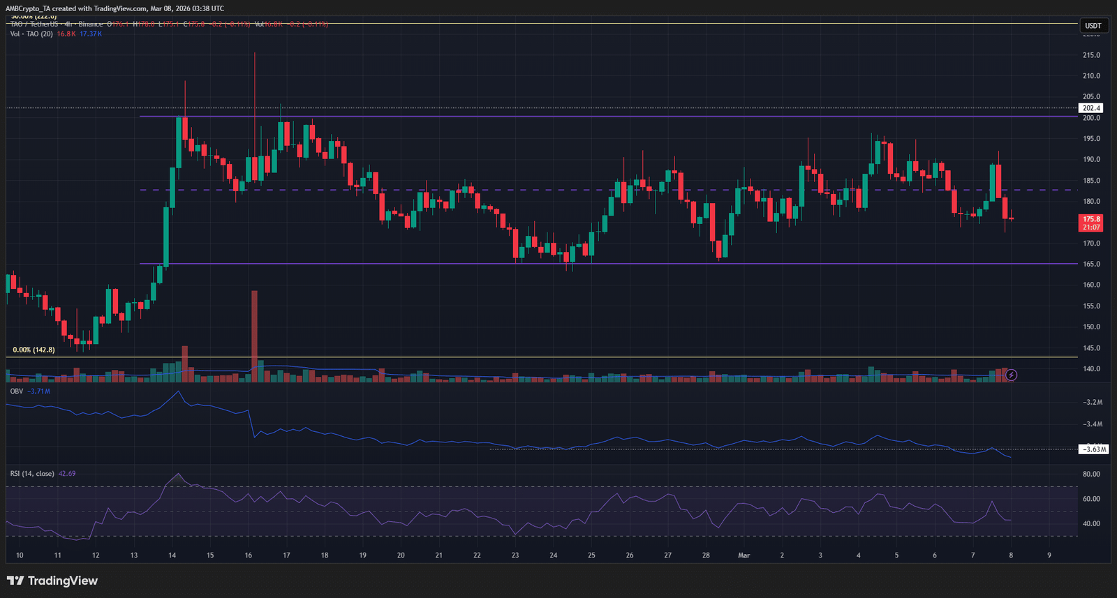 Abgesehen von der kurzfristigen Baisse wird TAO seit Mitte Februar innerhalb einer Spanne gehandelt. Diese Spanne reichte von 165 bis 200 US-Dollar.