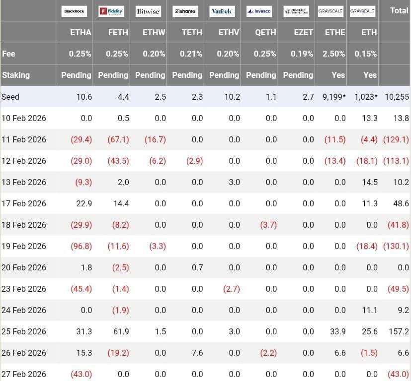 Beispielsweise verzeichnete BlackRock am 27. Februar einen Abfluss von 43 Millionen US-Dollar, der offenbar mit kurzfristigen Rebalancing-Aktivitäten zusammenhängt.