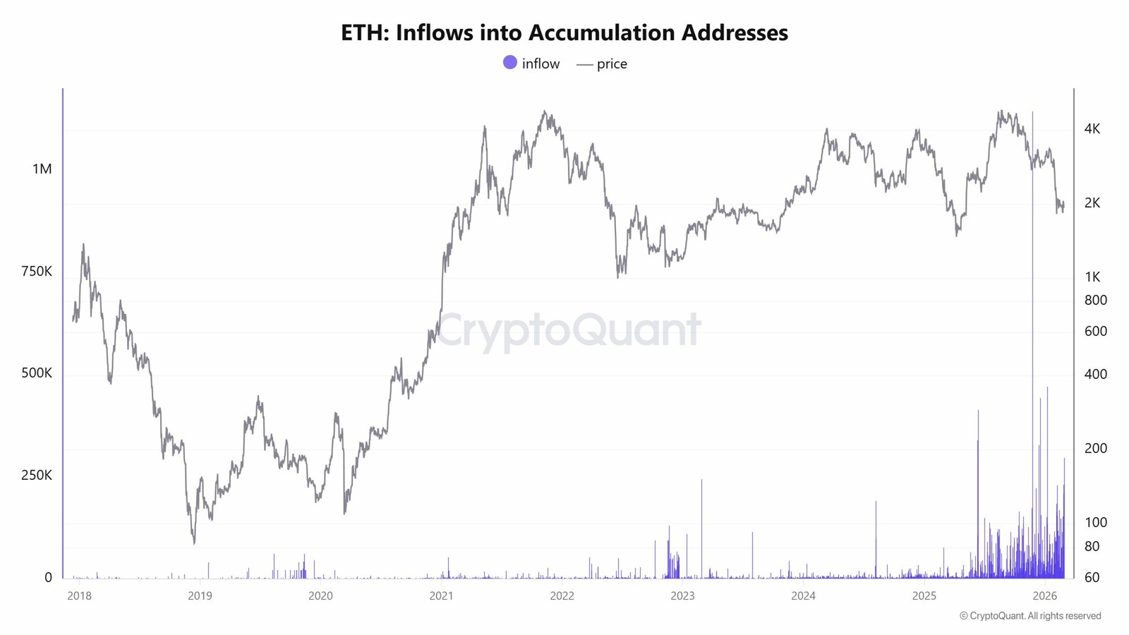 Dieses Verhalten deutet darauf hin, dass Großinhaber das während des Abschwungs frei gewordene Angebot nach und nach absorbieren. Ähnliche Zuflussmuster traten in früheren Korrekturphasen auf.