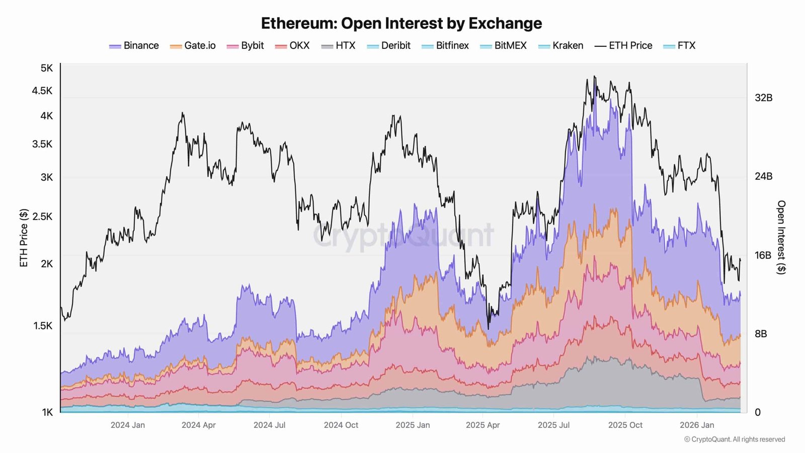 Offenes Interesse an allen Börsen fällen von etwa 7,79 Millionen ETH auf etwa 5,8 Millionen ETHDies signalisiert eine umfassende Risikoreduzierung bei den Händlern.