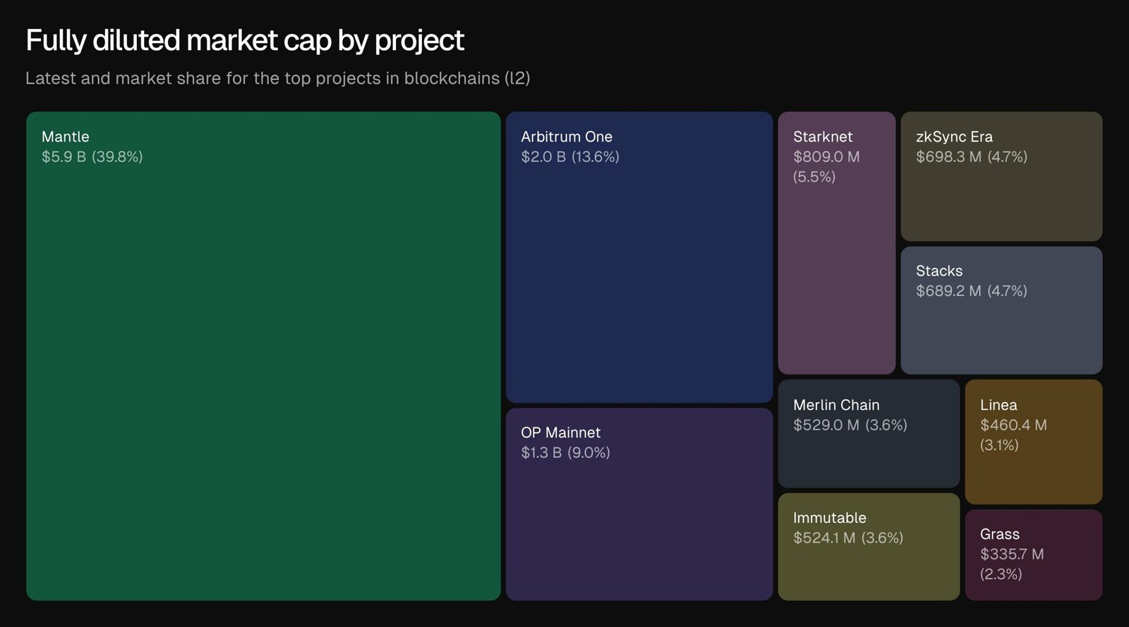 Optimismus gehörte auch zu den Projekten mit der höchsten Obergrenze unter den L2-Ketten. Mantle war mit einem Anteil von 39,8 % der größte, während Arbitrum One und OP Mainnet mit 13,6 % bzw. 9 % zurückblieben.