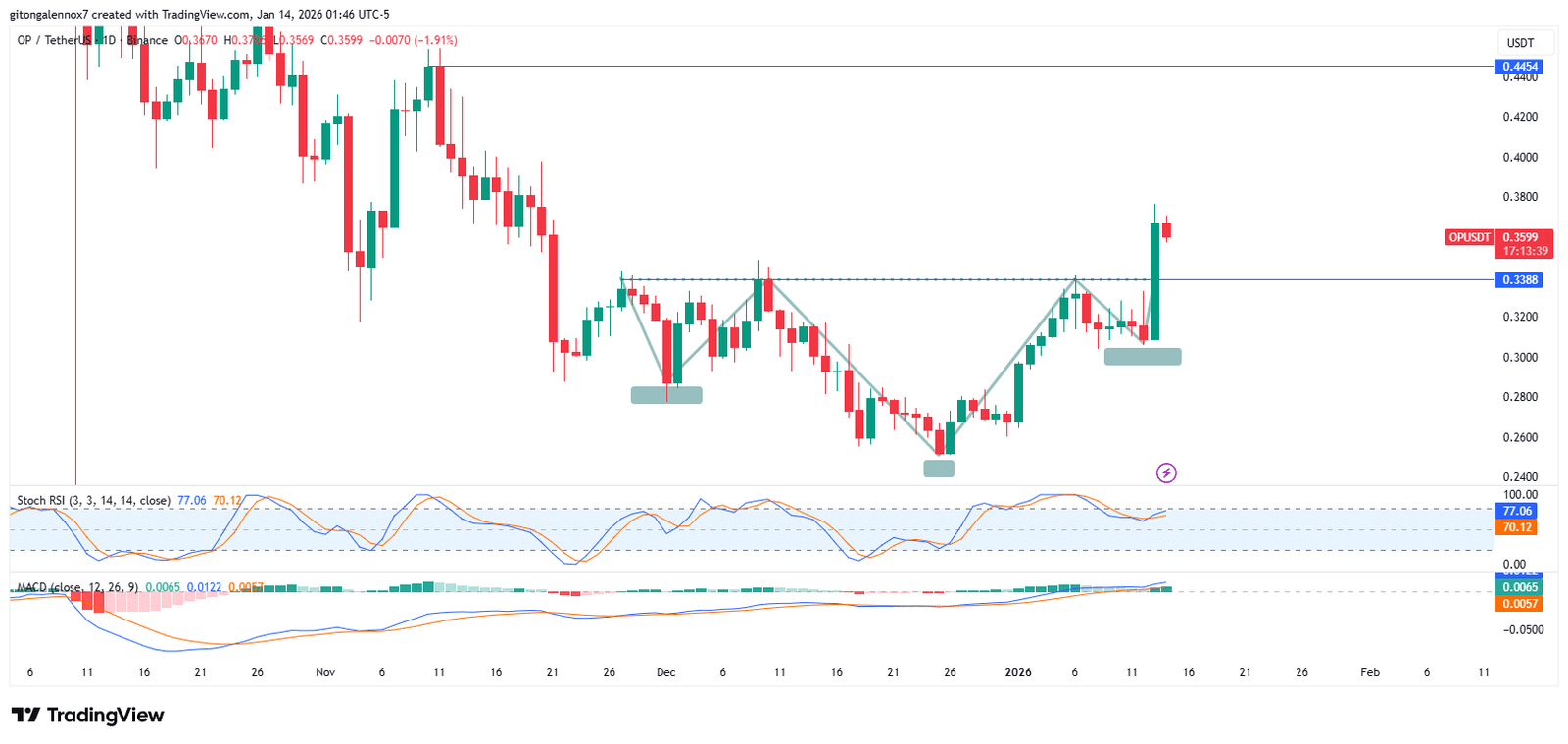 - Optimismus stieg im Preis um 13 %, während das Volumen in den letzten 24 Stunden um 140 % stieg.