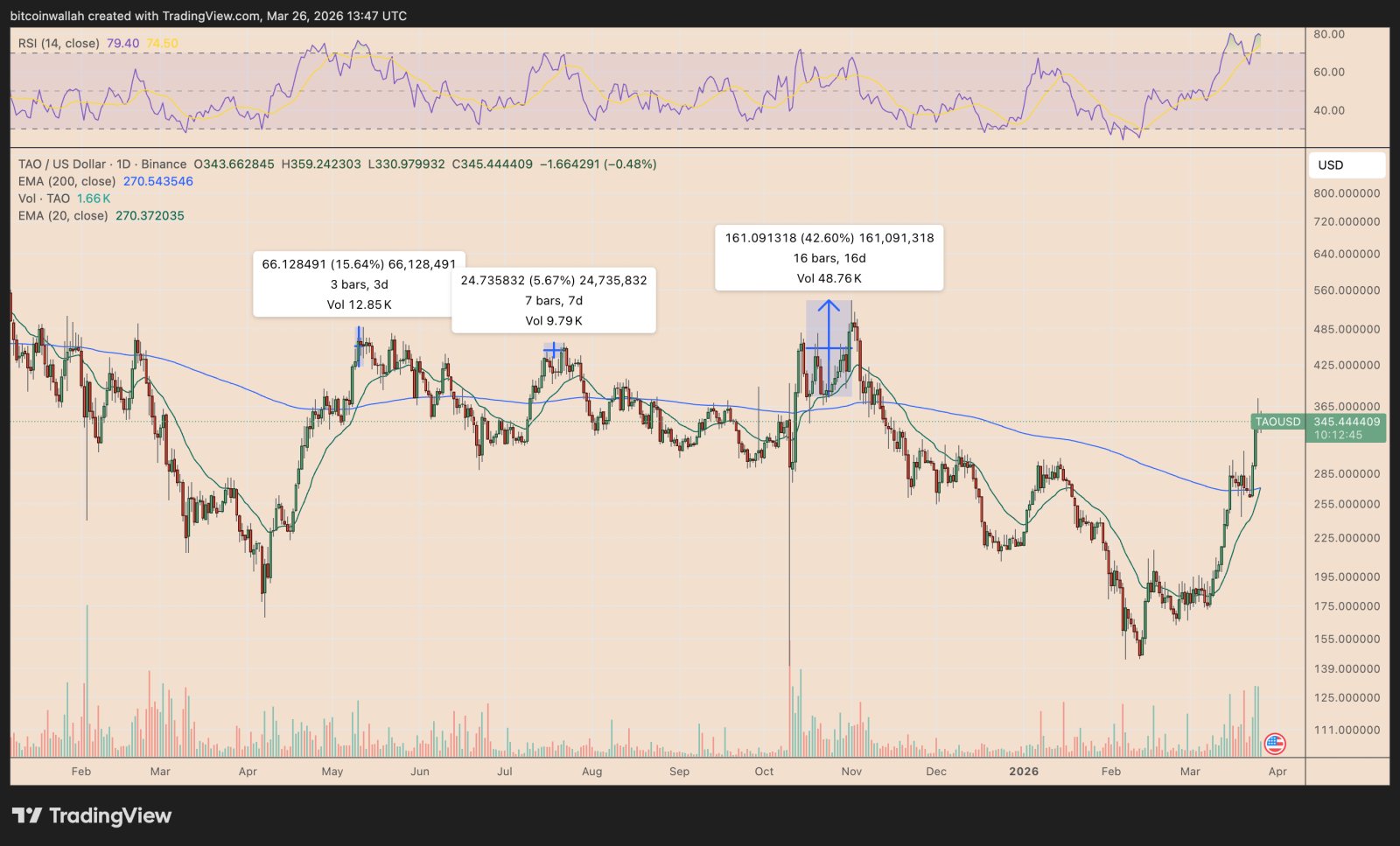Am Donnerstag, dem 26. März, überschritt der exponentiell gleitende 20-Tage-Durchschnitt von TAO (20-Tage-EMA, die grüne Linie) seinen exponentiell gleitenden 200-Tage-Durchschnitt (200-Tage-EMA, die blaue Welle).
