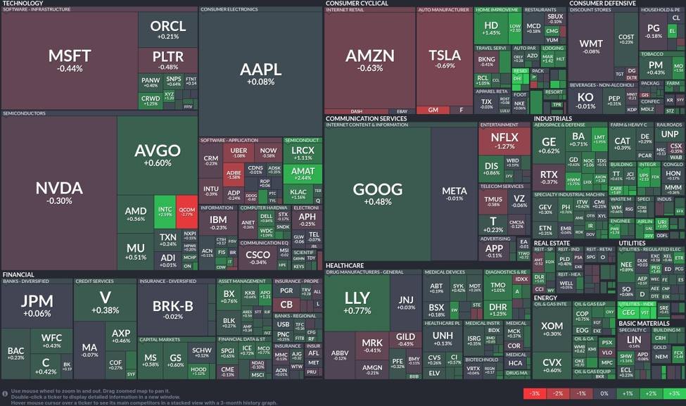 - 💉 Gesundheitswesen: Eli Lilly (LLY) lag mit einem Plus von 0,77 % an der Spitze und untermauerte die anhaltende Attraktivität des Sektors angesichts von Innovationen und Solidität im Gesundheitswesen.