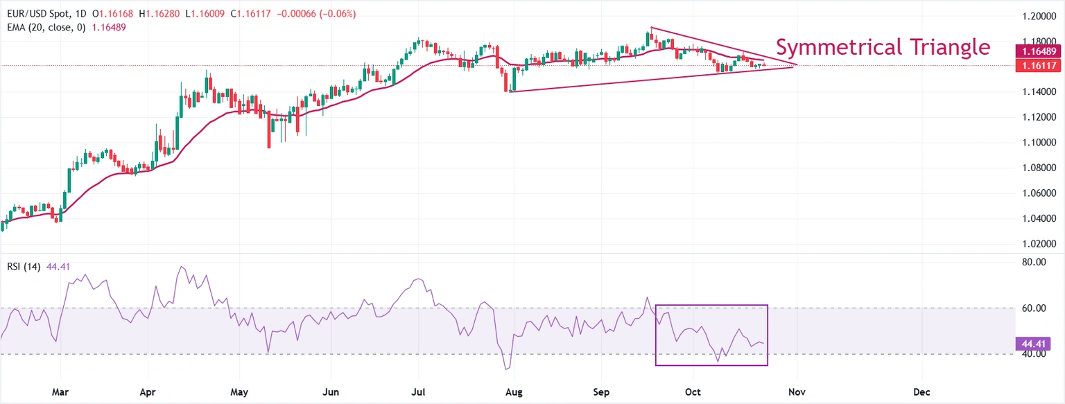 EUR/USD handelt während der späten europäischen Handelssitzung am Freitag in einer engen Spanne knapp über 1,1600. Das Hauptwährungspaar zeigt einen breiteren Seitwärtstrend inmitten einer Chartmusterformation eines symmetrischen Dreiecks.