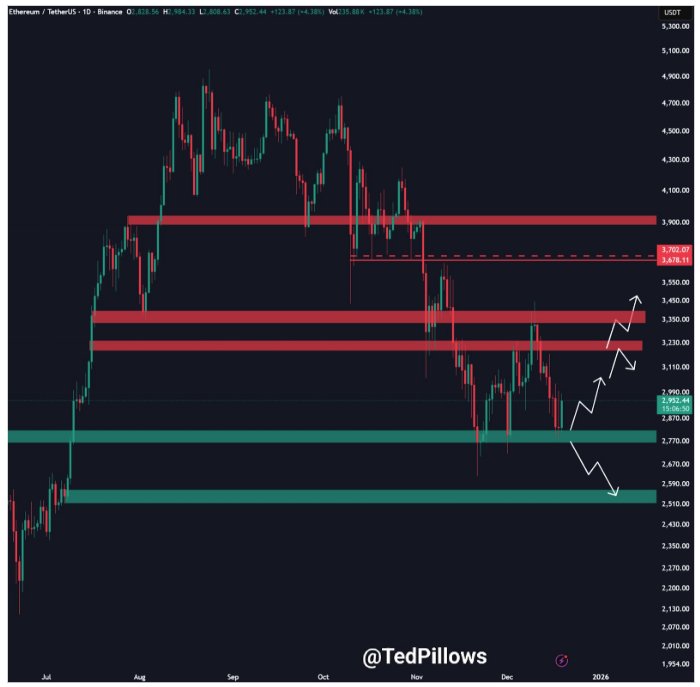 Der Kryptoanalyst Ted Pillows hat den On-Chain-Signalen eine preisbasierte Perspektive hinzugefügt skizzierte eine klare technische Roadmap für den nächsten Schritt von Ethereum. Seiner Analyse zufolge hat ETH kürzlich eine wichtige Nachfragezone zwischen 2.700 und 2.800 US-Dollar erschlossen und hat begonnen, sich von diesem Bereich zu erholen. Diese Bewegung erfolgte, als Ethereum diese Woche erneut unter 3.000 US-Dollar fiel und am 18. Dezember ein Tief von 2.781 US-Dollar erreichte, das in der folgenden Grafik als wichtiges Unterstützungsband hervorgehoben ist.