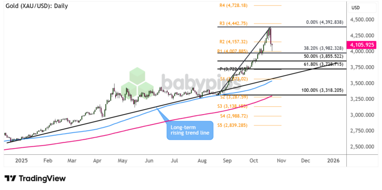 Die Bullen scheinen jedoch zu Atem zu kommen, was einen Rückzug in die Nähe des 38,2 %-Fibonacci-Retracement-Levels nahe R1 (4.007,88 $) und eine wichtige psychologische Unterstützung auslöste.