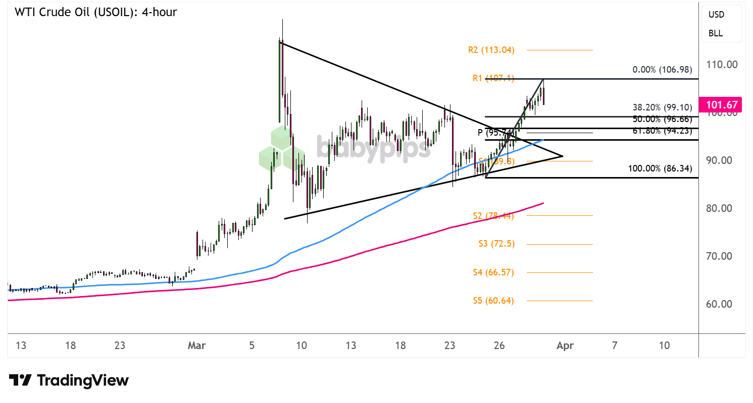 Der 38,2 %-Fib-Wert liegt etwa bei 99 $ pro Barrel, während der 50 %-Fib-Wert mit dem Pivot-Punkt (95,74 $) zusammenfällt. Das Niveau von 61,8 % könnte die Sandlinie für einen zinsbullischen Pullback sein, da es mit dem früheren Dreieckswiderstand und der dynamischen Unterstützung von 100 SMA übereinstimmt.