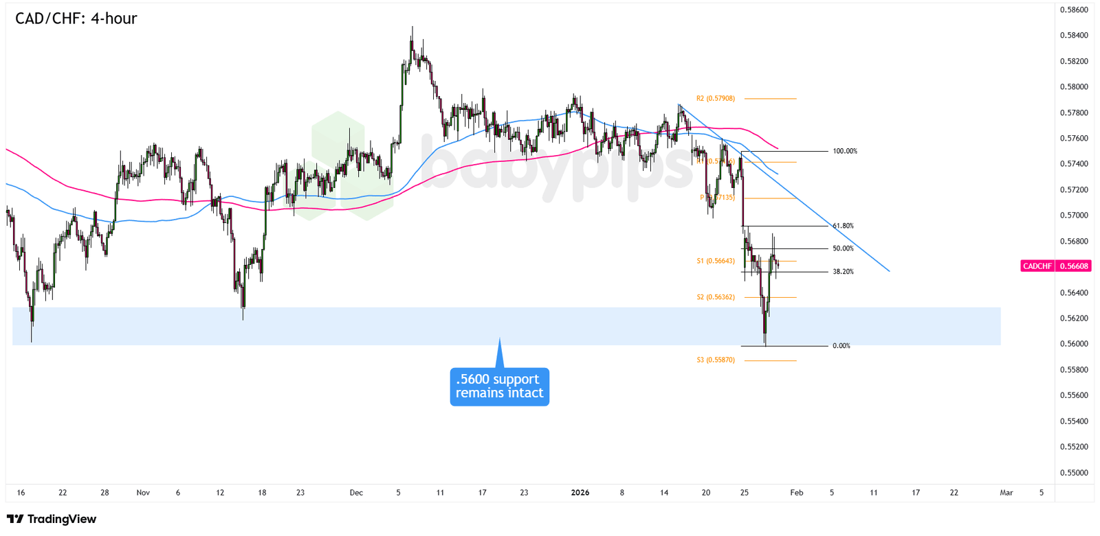 Beide Szenarien öffnen die Tür für einen weiteren erneuten Test der wichtigen Unterstützungszone nahe .5600. Ein anhaltender Handel unterhalb dieses Bereichs könnte dazu führen, dass CAD/CHF tiefer in Richtung Mehrjahrestiefs abrutscht.