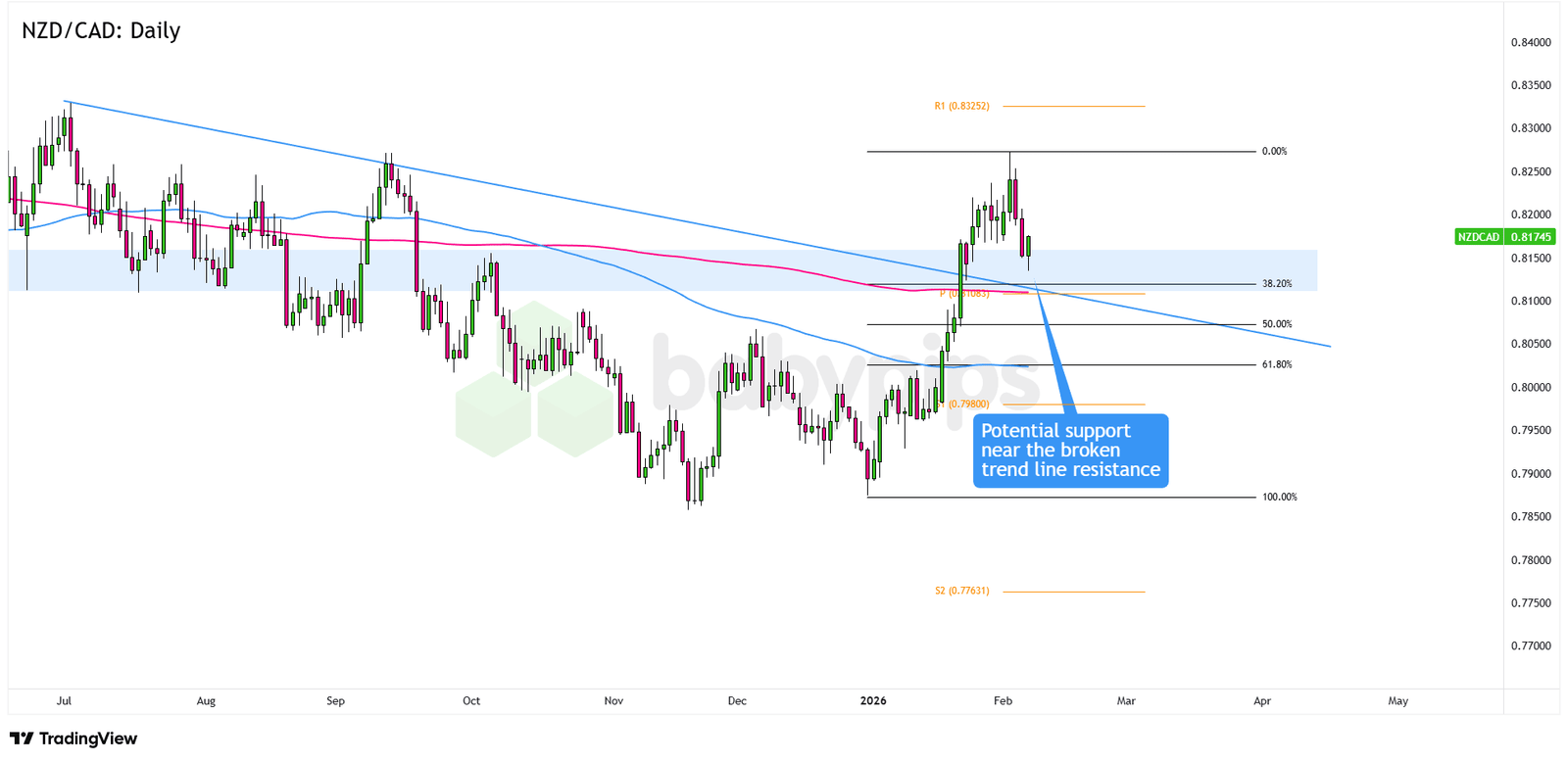 Wir beobachten diesen technischen Bereich eher von der Seite, da er mit den 38,2 % übereinstimmt. Fibonacci-Retracement des Aufschwungs von 2026, der Pivot-Punkt bei .8108, der 200 SMA und der frühere Trendlinienwiderstand.