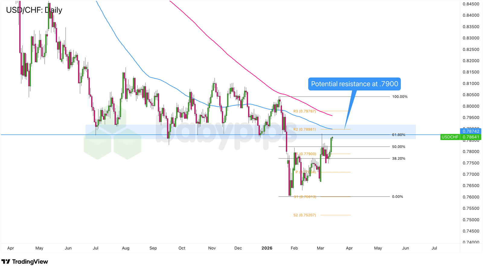 Wie Sie sehen können, diente die Zone in der zweiten Hälfte des Jahres 2025 als wichtige Unterstützung. Dieses Mal liegt sie auf einer Linie mit 61,8 %. Fibonacci-Retracement des Januar-Abschwungs und liegt in der Nähe der Pivot-Point-Linie R2 (.7898) sowie der 100 und 200 SMAs auf dem Tages-Chart.