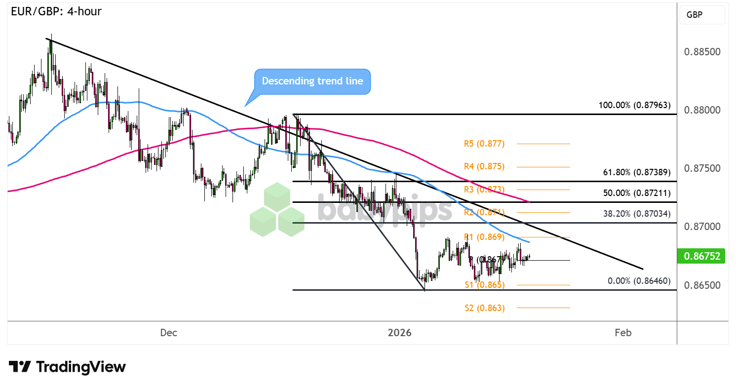 Das Paar nähert sich der 38,2 %-Fib-Marke in der Nähe des Trendlinienwiderstands, knapp zwischen R1 (.8690) und R2 (.8710). Umkehrkerzen in dieser Region könnten darauf hindeuten, dass die Bären versuchen, die Kontrolle zurückzugewinnen, was den Preis möglicherweise wieder auf den Weg in Richtung eines Abrutschens auf das Swing-Tief oder das nächste Unterstützungsniveau bei S2 (0,8630) bringen könnte.