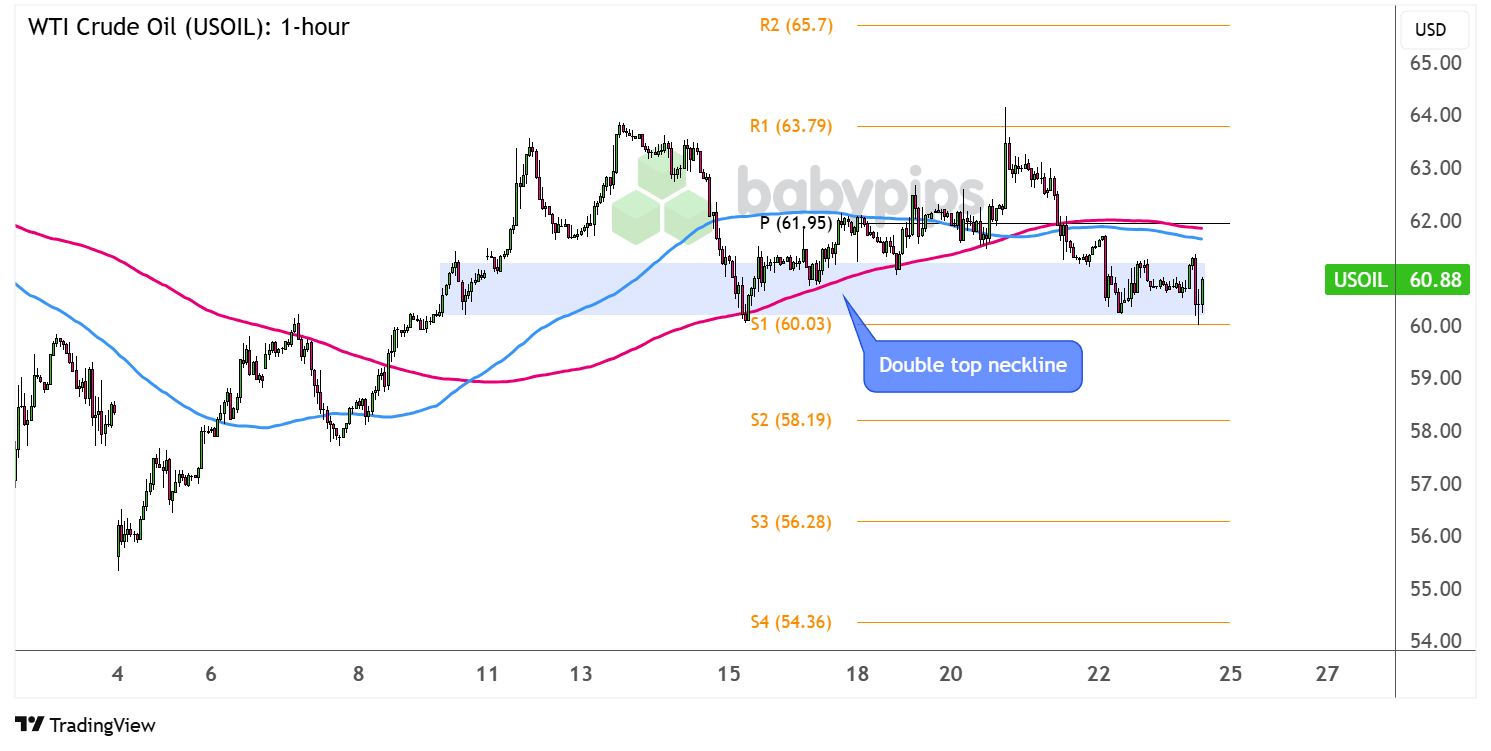 Auf der anderen Seite könnten Umkehrungs -Candlesticks darauf hindeuten, dass ein weiterer Sprung fällig ist und möglicherweise den Preis wieder auf die Höchststände in der Nähe von R1 (63,79 USD) oder zumindest bis zum Pivot -Point -Level (61,95 USD) auf halbem Weg sendet.