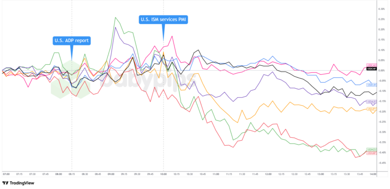 Als ADP einen Stellenabbau von 32.000 anstelle eines Zuwachses von 15.000 bestätigte, rutschte der Dollar weiter ab, erholte sich aber kurzzeitig. Der schnelle Schritt schien zu Gewinnmitnahmen zu führen, als die US-Sitzung begann und die Händler auf den ISM-Services-Bericht warteten.