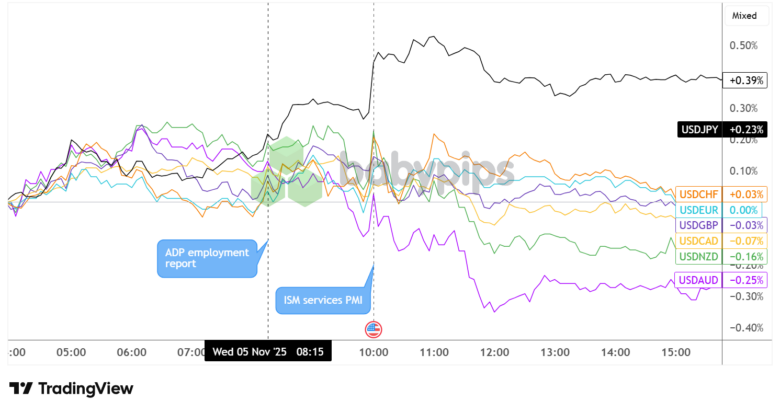 Der US-Dollar, der vor der Veröffentlichung leicht gesunken war, zeigte nach der Veröffentlichung des ADP-Berichts um 8:15 Uhr ET eine allgemein positive Reaktion, da er gegenüber den meisten Hauptwährungen zulegte, bevor der nächste wichtige Datenpunkt fiel.