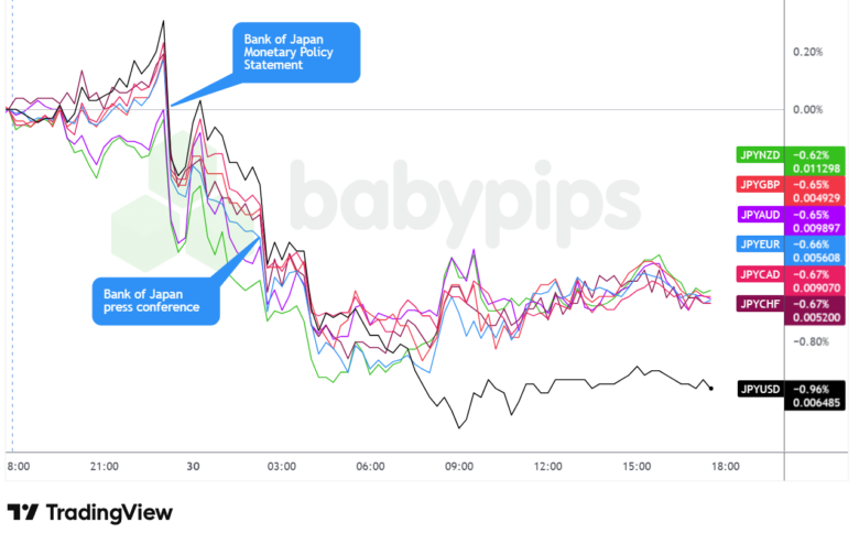 Der japanische Yen war während der Sitzung am Donnerstag die Hauptwährung mit der schlechtesten Performance und erlebte starke Rückgänge, die sowohl mit der Veröffentlichung der geldpolitischen Erklärung als auch mit der Pressekonferenz von Gouverneur Ueda zusammenhingen.