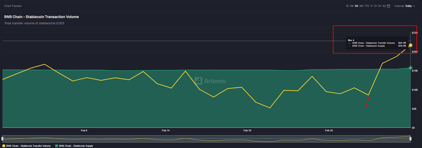 In jüngerer Zeit verzeichnete die BNB-Kette an einem einzigen Tag Stablecoin-Transfers im Wert von 21,7 Milliarden US-Dollar. Dieser Meilenstein markierte den höchsten Stand im vergangenen Jahr.