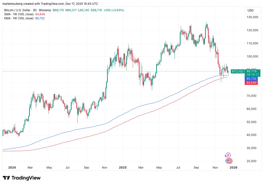 Für Caleb Franzen, Erfinder der Handelsressource Cubic Analytics, waren die einfachen (SMA) und exponentiellen (EMA) gleitenden 100-Wochen-Durchschnitte von Bitcoin von entscheidender Bedeutung.