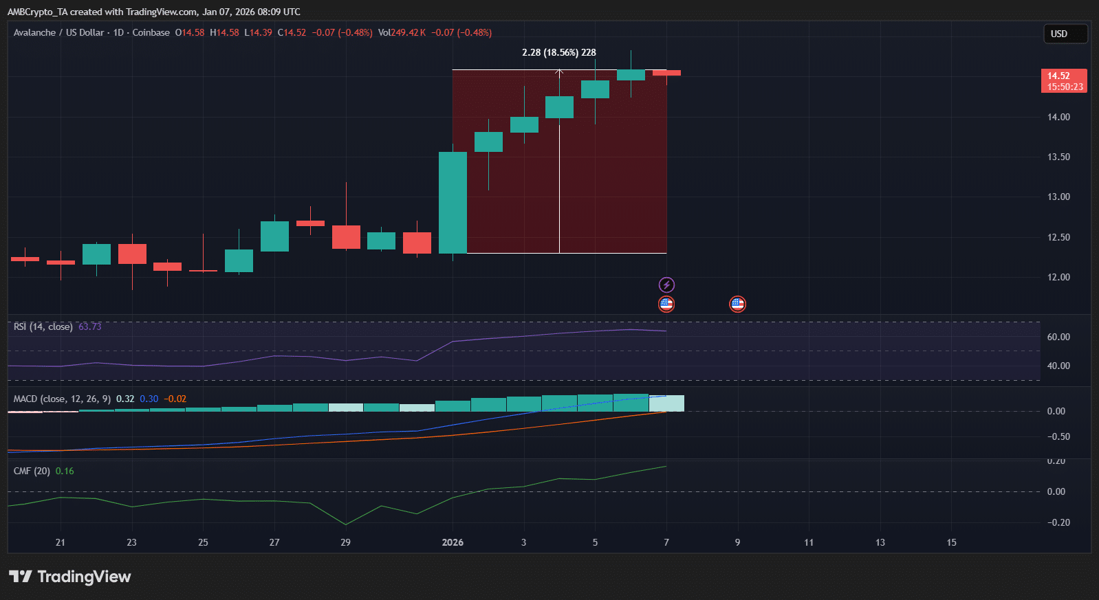 Die Münze legte diese Woche um etwa 15 % zu und brach aus ihrer jüngsten Spanne aus, da der Kaufdruck zusammen mit der zunehmenden Netzwerkaktivität zunahm. Der Preis stieg vom Bereich von 12,30 $ in Richtung 14,50 $.