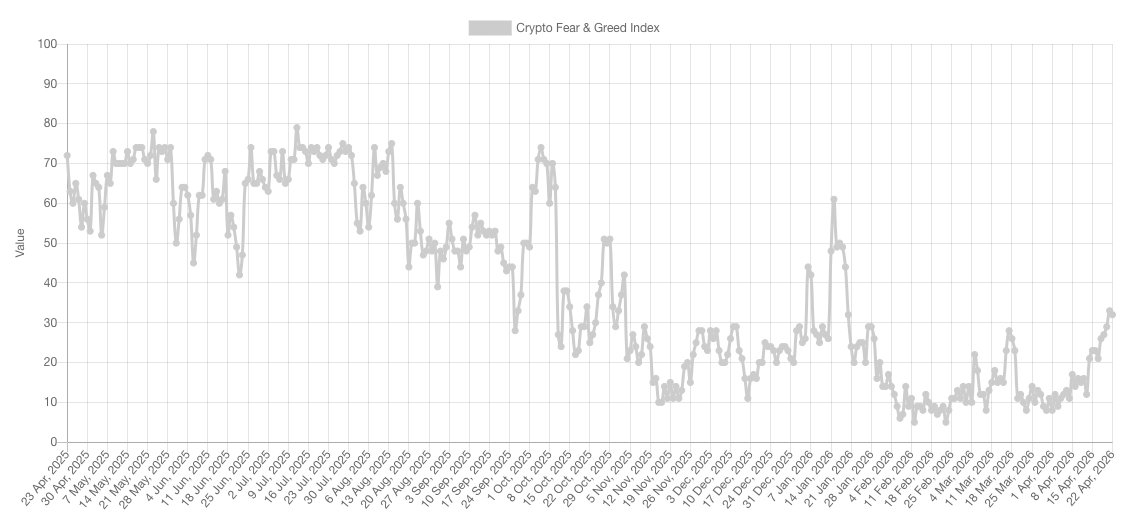 Fear & Greed erreichte am Mittwoch einen Wert von 32/100 – immer noch in der „Angst“-Zone, nähert sich aber wie BSI ebenfalls der „neutralen“ Zone.