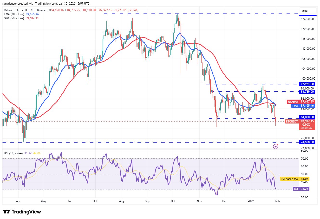 BTC drehte am Donnerstag vom exponentiellen gleitenden 20-Tage-Durchschnitt (EMA) (89.165 $) stark nach unten und fiel unter die Unterstützung von 84.000 $.