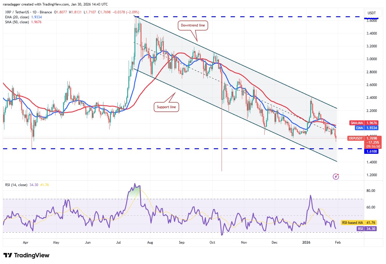 Das XRP/USDT-Paar wird wahrscheinlich auf 1,61 US-Dollar fallen, was ein kritisches Niveau ist, auf das man achten sollte. Wenn Verkäufer den XRP-Preis unter die 1,61-Dollar-Unterstützung drücken, besteht die Gefahr, dass das Paar auf die Unterstützungslinie des absteigenden Kanalmusters fällt.