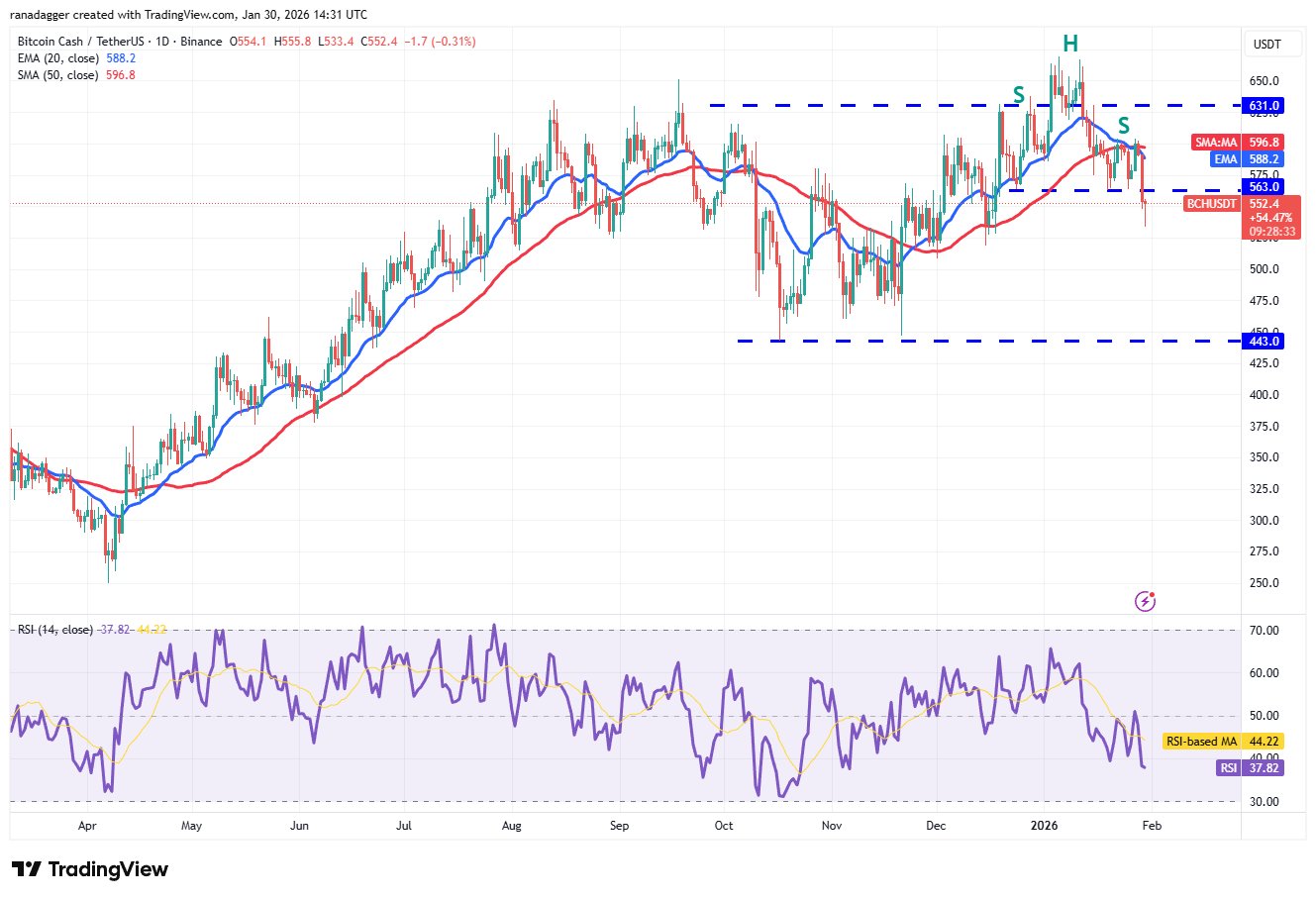Bitcoin-Bargeld (BCH) fiel am Donnerstag unter die Unterstützung von 563 $ und vervollständigte damit ein rückläufiges Kopf-Schultern-Muster.