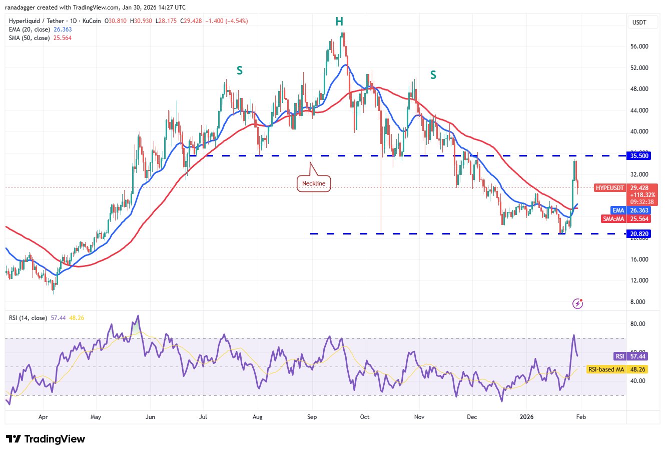 Der 20-Tage-EMA (26,36 $) ist die entscheidende Unterstützung, auf die man auf der Abwärtsseite achten sollte. Wenn der Preis über dem 20-Tage-EMA steigt, werden die Bullen erneut versuchen, das HYPE/USDT-Paar über 35,50 US-Dollar zu treiben. Wenn ihnen das gelingt, könnte das Paar auf 44 US-Dollar steigen.