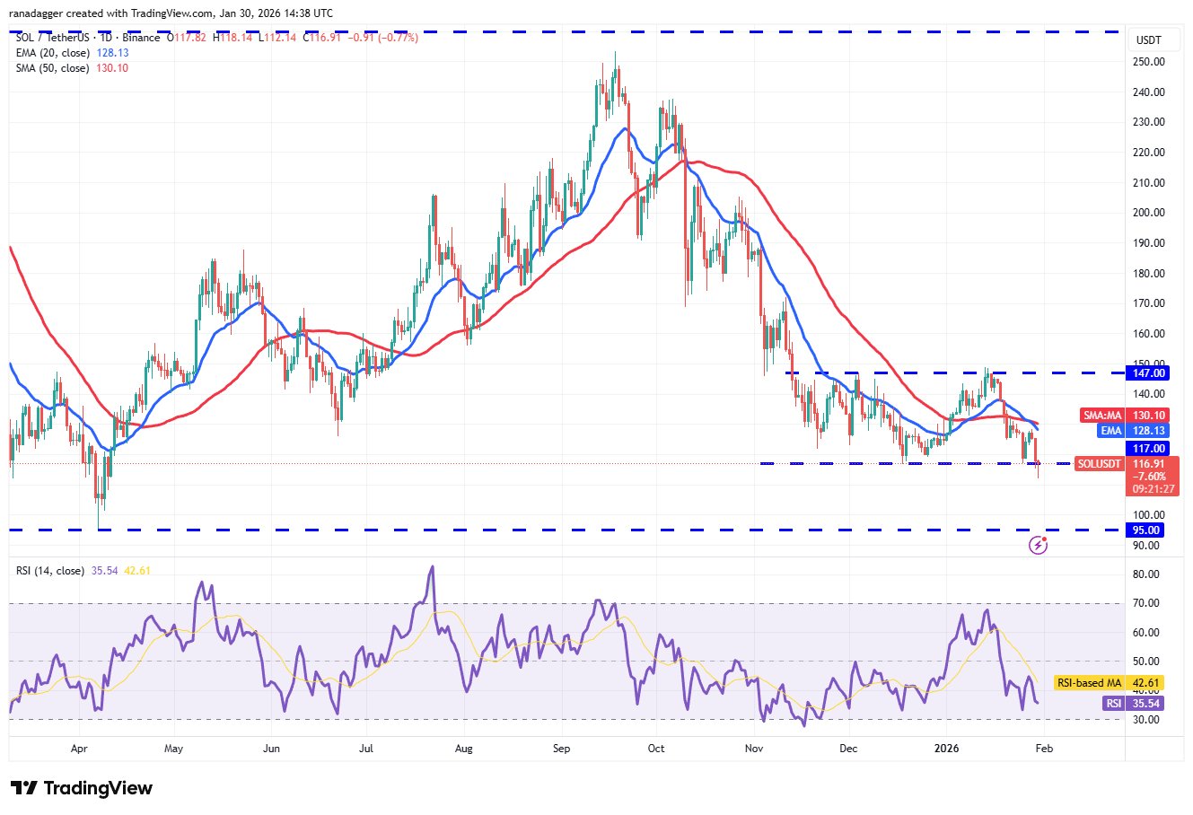 Solanas (SOL) schwankte die Spanne von 117 bis 147 US-Dollar am Donnerstag nach unten, was signalisiert, dass die Bären versuchen, die Führung zu übernehmen.